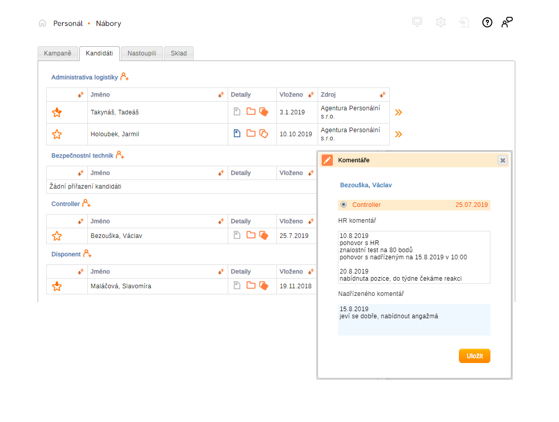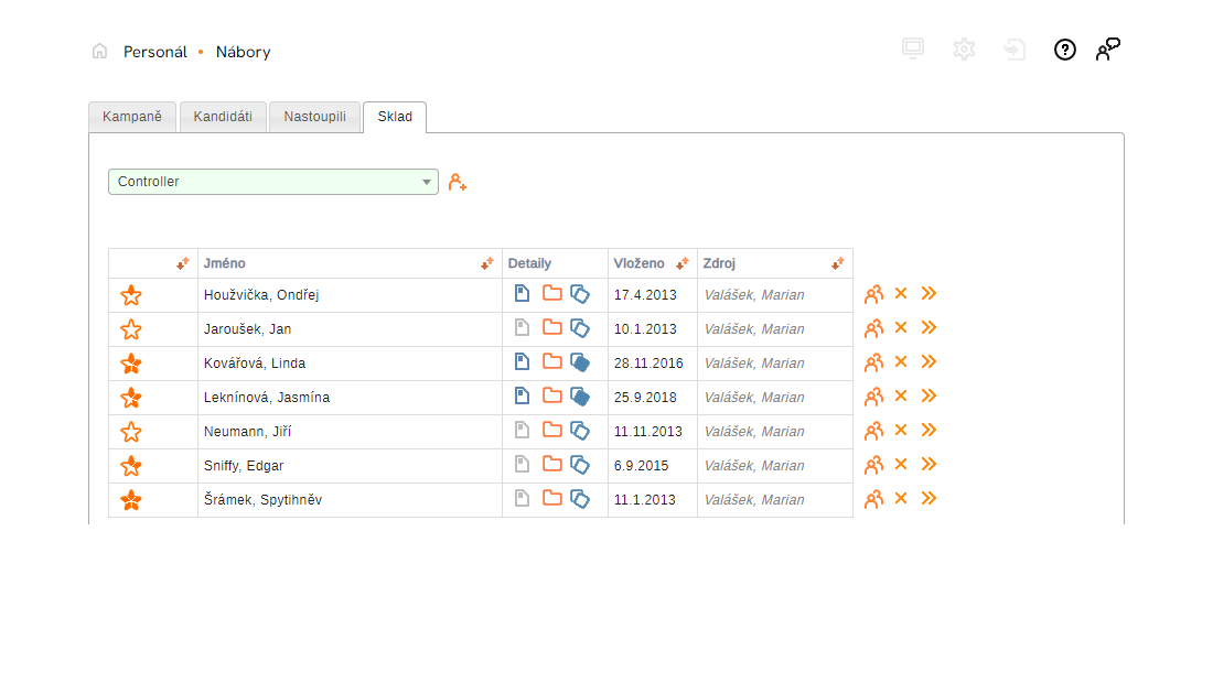 Na záložce Kandidáti jsou uchazeči řazeni pod pozicemi, na které byli nabídnuti. Odtud mohou být přesunuti do záložky Nastoupili, případně do záložky Sklad, která slouží jako archiv pro jejich možné alternativní využití v budoucnu.