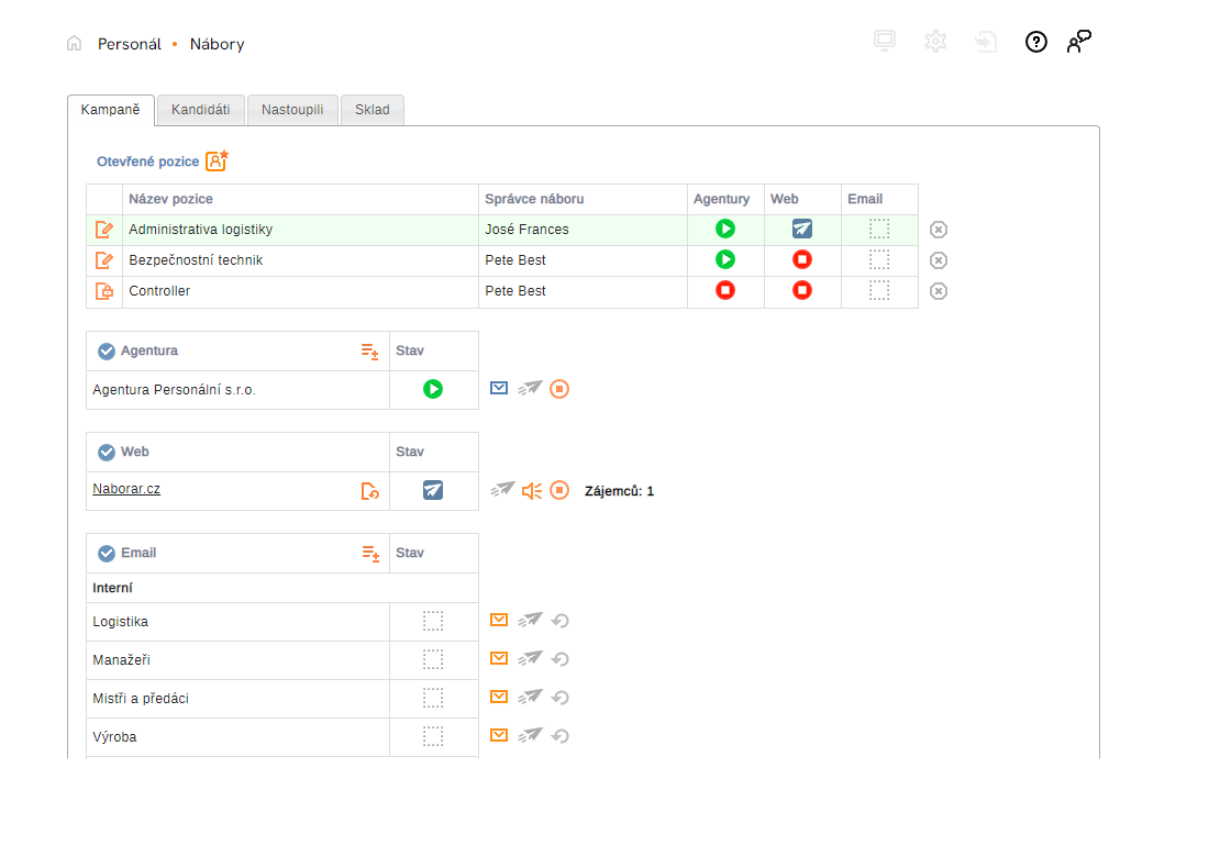 Pozici se založeným inzerátem lze otevřít pro náborovou kampaň. Poté se inzerát pozice odešle agenturám, na web Náborář.cz nebo na emaily dle distribučních seznamů. Funkční ikony vždy znázorňují aktuální stav kampaně a dostupné operace s inzercí.