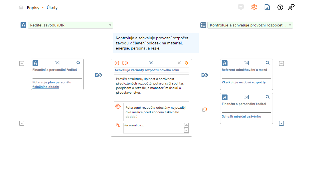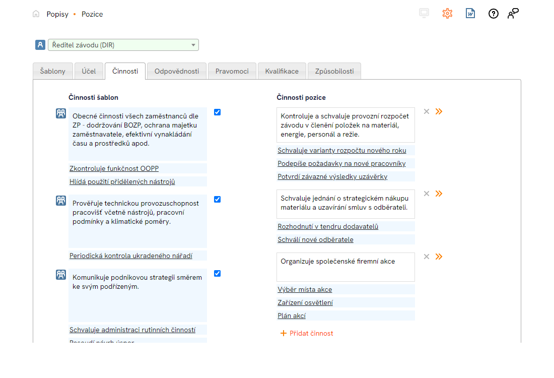 Činnosti jsou definovány až do úrovně konkrétních úkolů s jednoznačně určeným kritériem výkonu. Významnou funkčností je vytváření vstupních a výstupních vazeb mezi úkoly jednotlivých pozic a jejich zřetězení do firemních procesů.