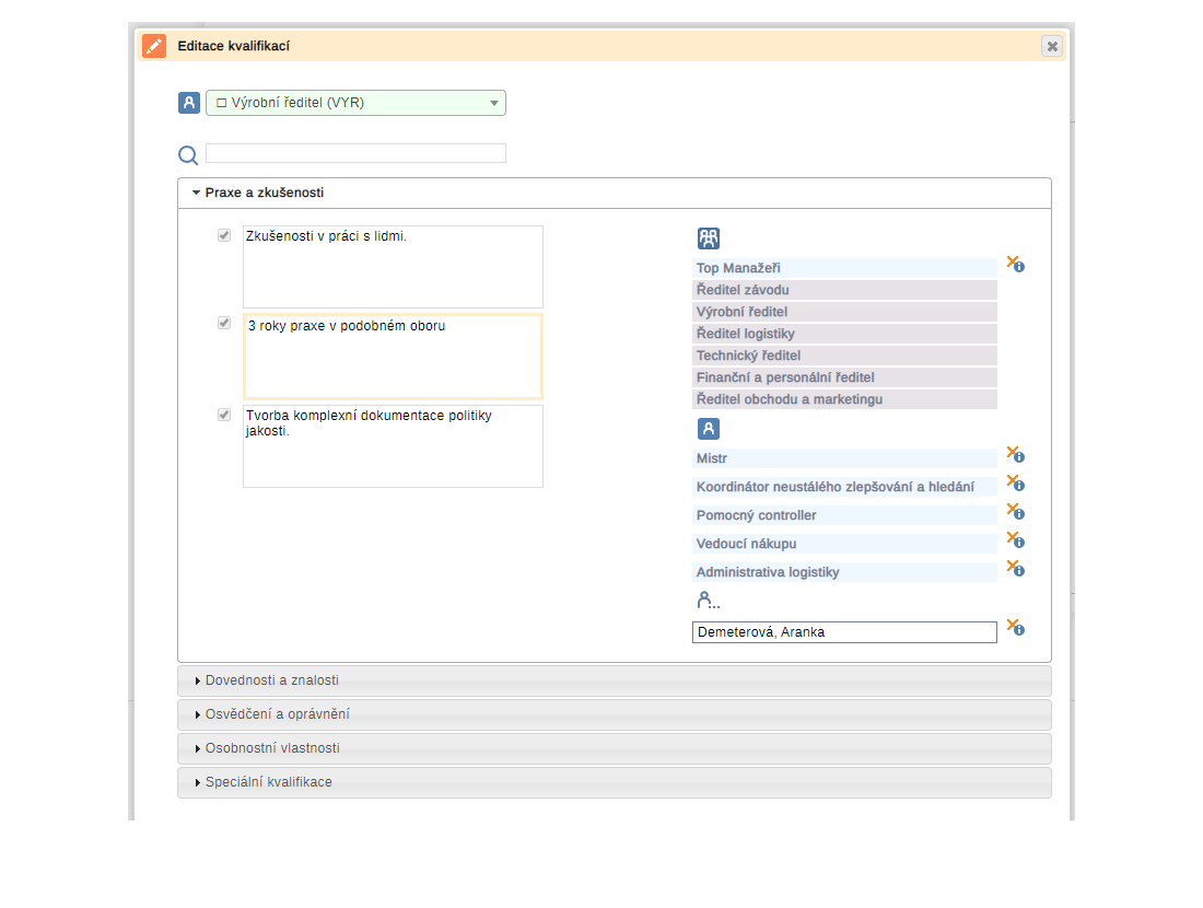 Kromě účelu a činností, které jsou pro každou pozici jedinečné, se ostatní položky editují ve sdílených oknech. V nich jsou vypsány šablony, pozice, funkce a jedinci, kteří mají danou položku přiřazenu, a jichž se dotkne případná změna definice.